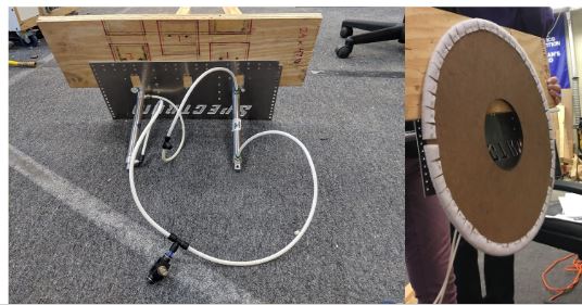 Here is our quick prototype of a simple pneumatic hatch mechanism. This is mounted just inside your frame perimeter on the front or back of your robot. You acquire a hatch by driving into the loading station hatch panel and the velcro takes it off the panel, the velcro is only on the top quarter of the hatch panel.. There are then 2 4″-6″ pneumatic cylinders behind the panel and below all the velcro that let you push the panel on to any of the level one targets. This also works with a lot of misalignment and over your bumper. This design also doesn’t let you throw the panel because if you activate the cylinder not at a wall the panel just flip ups and doesn’t leave your robot.