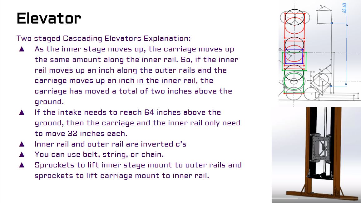 Each subsystem team is responsible for making a few slides about their design and progress and presenting to the team. Here is an example slide from the elevator subsystem team.