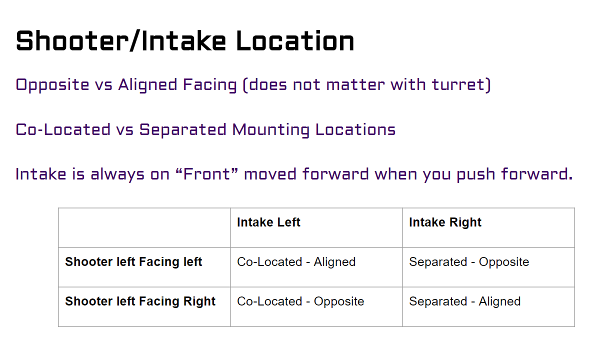 Our current plan is to have the intake on one side of the robot and the shooter facing the opposite direction (Opposite – Separated) so we can easily acquire more balls in autonomous or from the feeder station and return to a shooting position without turning around. The feeder station may also be able to roll balls directly towards our intake.
