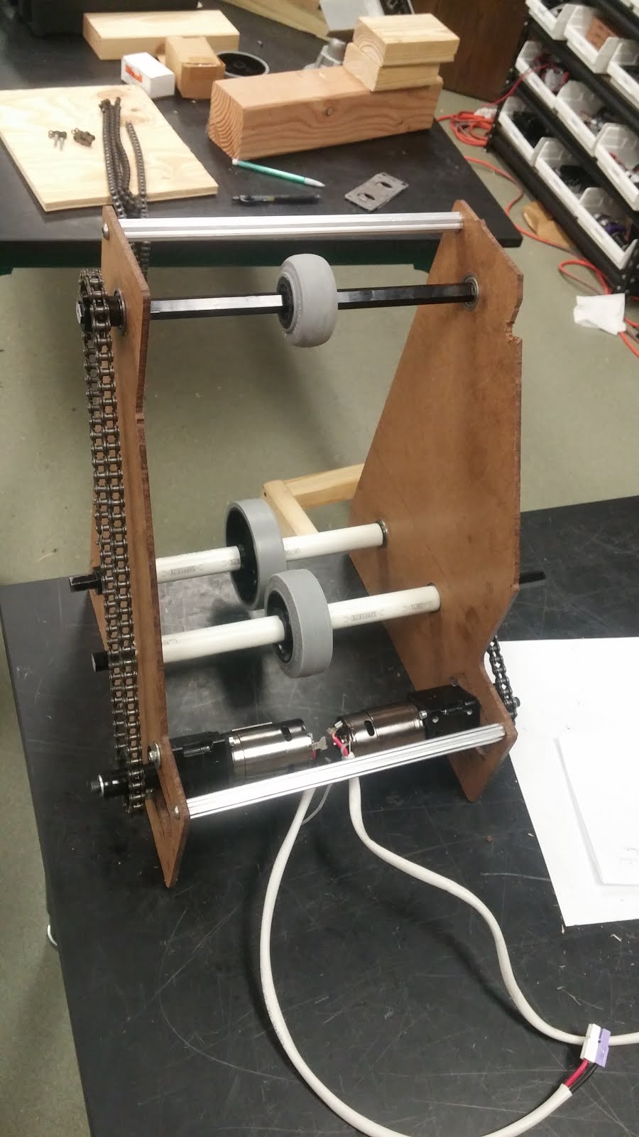 This setup seems slightly easier package inside the frame of our robot while still staying under the low bar. Using two 775pros geared 3:1 we were able to make around a 15 shot from 1 ft off the ground. This setup currently doesn’t give us the spin we are looking for. Tomorrow we will likely be slowing down the top roller and making the button two rollers run off separate motors to make sure we aren’t slowing down the final wheel to much before the ball ever reaches it. We’ll also start running the prototype off of a roboRIO and Talon SRX motor controllers so we can monitor the speed of the wheels and eventually add PID closed loop control to start working on consistency. We will still need to play around with wheel configurations, compression, wheel width, wheel speeds, and more.