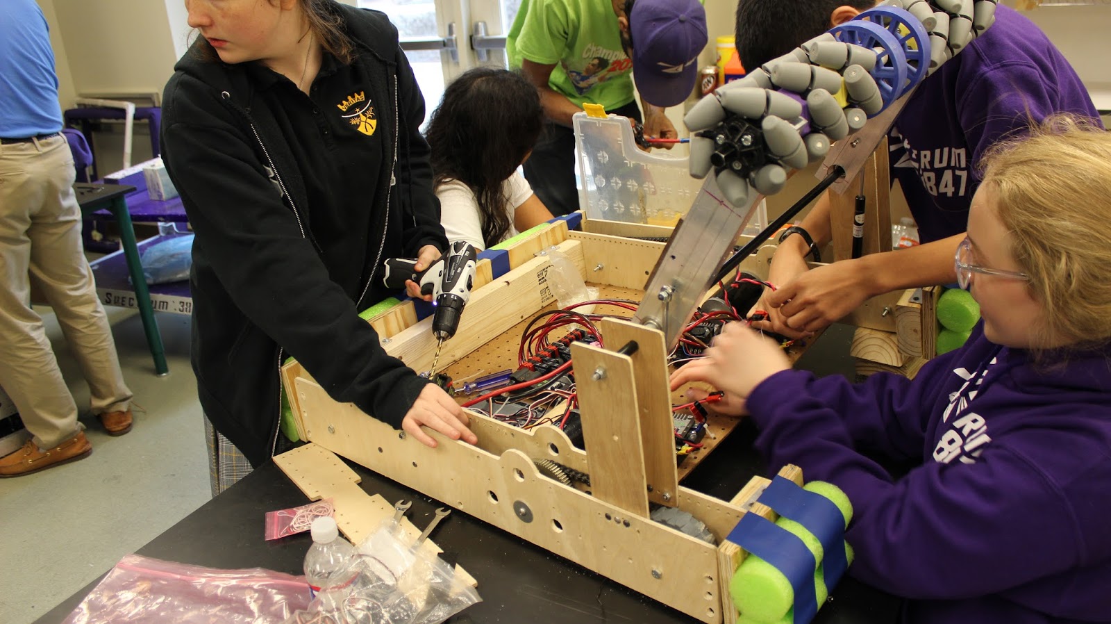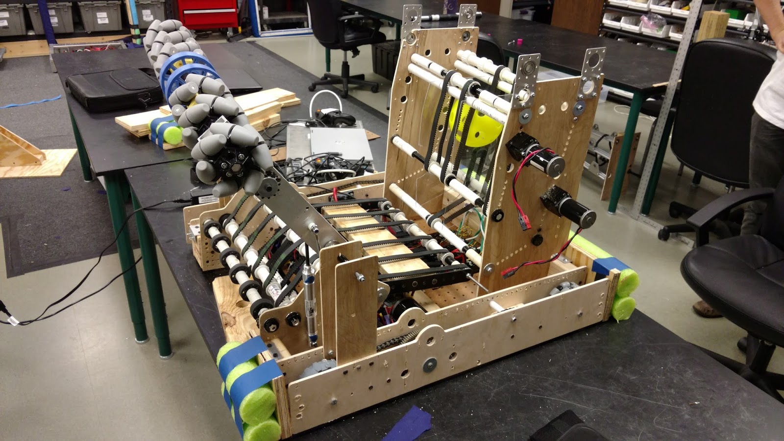 Here is the current form of the prototype, we should be able to have it shooting balls tomorrow or Friday. This wooden version of our robot is named “Radio”