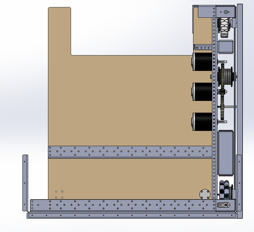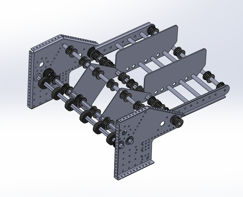 The main intake will be made from timing belts and WCProduct compliant wheels. Its job is to pull in balls throughout the match so we are ready to fire into the Boiler when the time comes. We are still working out pulley spacing, conveyor compression, etc. The design goal is that the balls come up the bottom of the hopper so that they push the balls above it up and out of the way. These balls appear to slide very nicely with each other so that should work well. The belts at the back of the conveyor are the first step in organizing the balls for the elevator. Balls held above the first layer will be able to fall in one of three tracks when entering the elevator. This may mean that our left and right channels have access to a few more balls then the center channel. We also plan to work out a way to agitate our ball hopper area to move balls on top of the first layer so they will rest into one of the three channels.