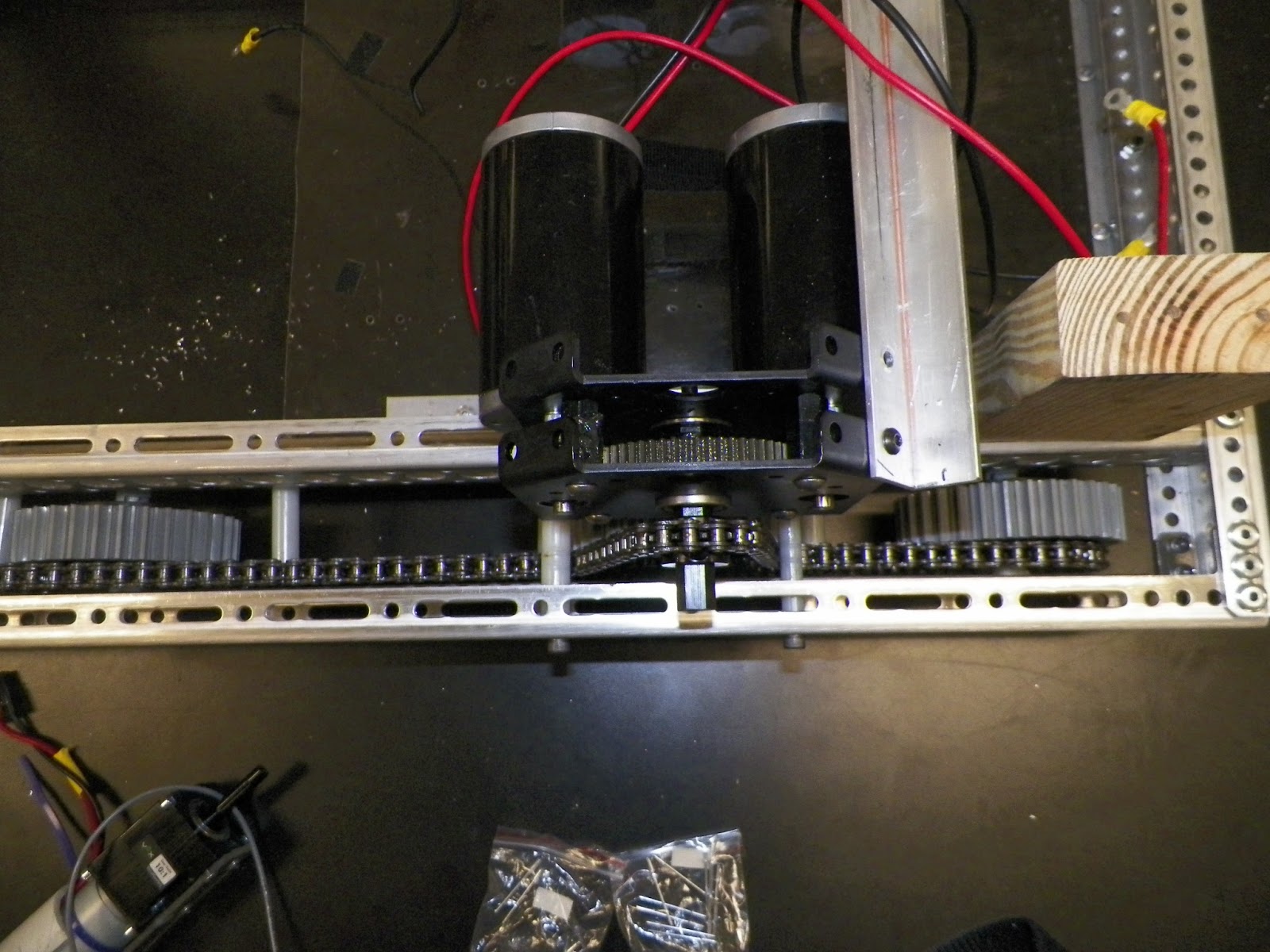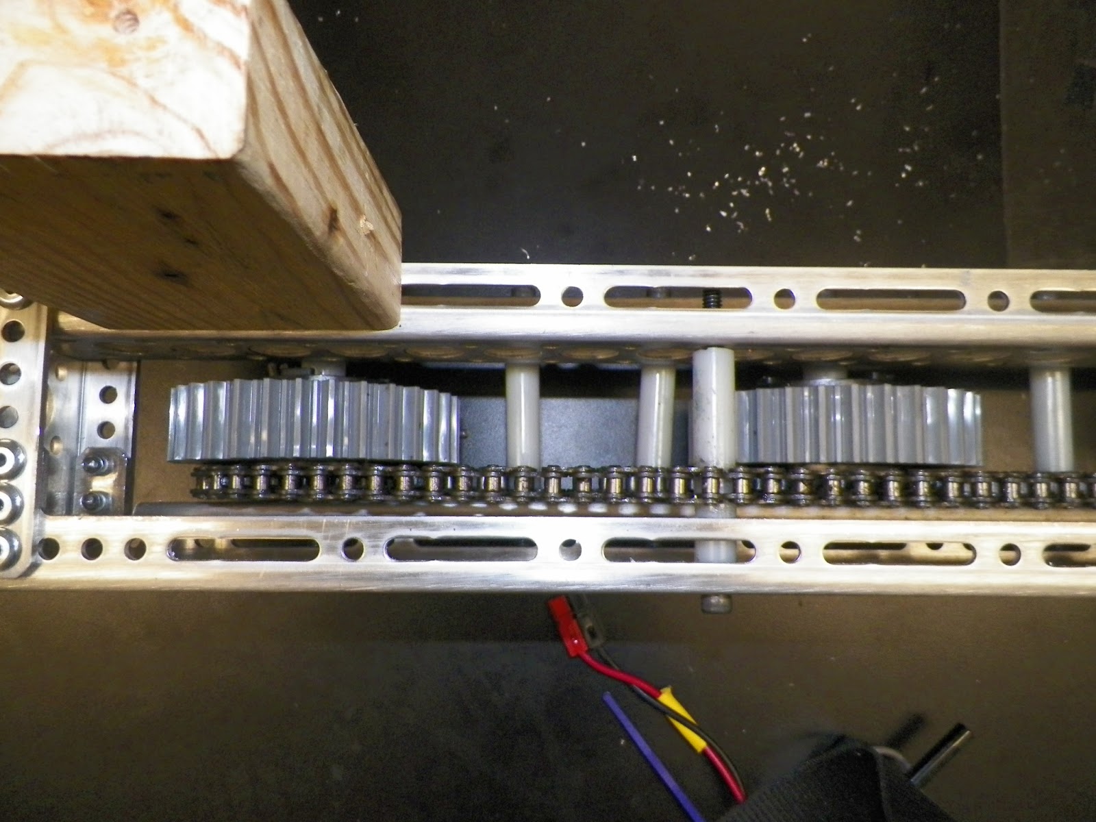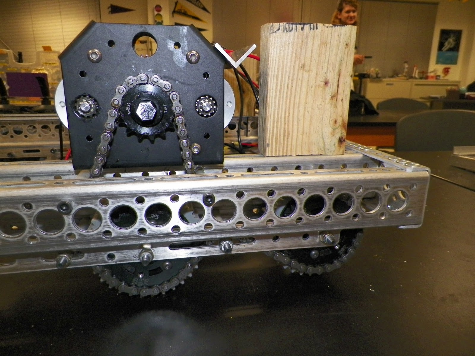 The VEXpro drive train is now riveted with 1/4″ steel rivets. We want to be extra sure our chassis won’t come apart. Here are a lot of pictures of our modifications to the chassis. We now have a full 15.5 inches between the wheel wells because we moved to a single loop of chain and the versawheels. We will be mounting CIMs #5 and #6 in the future.
