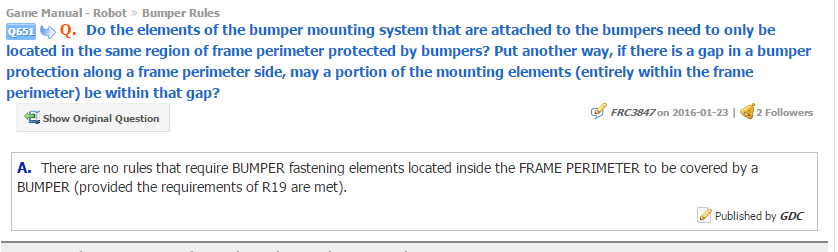 This means that the brackets inside your robot’s frame perimeter but permanently attached to your bumpers have to be between 4″ and 12″ from the ground like the rest of your bumpers.