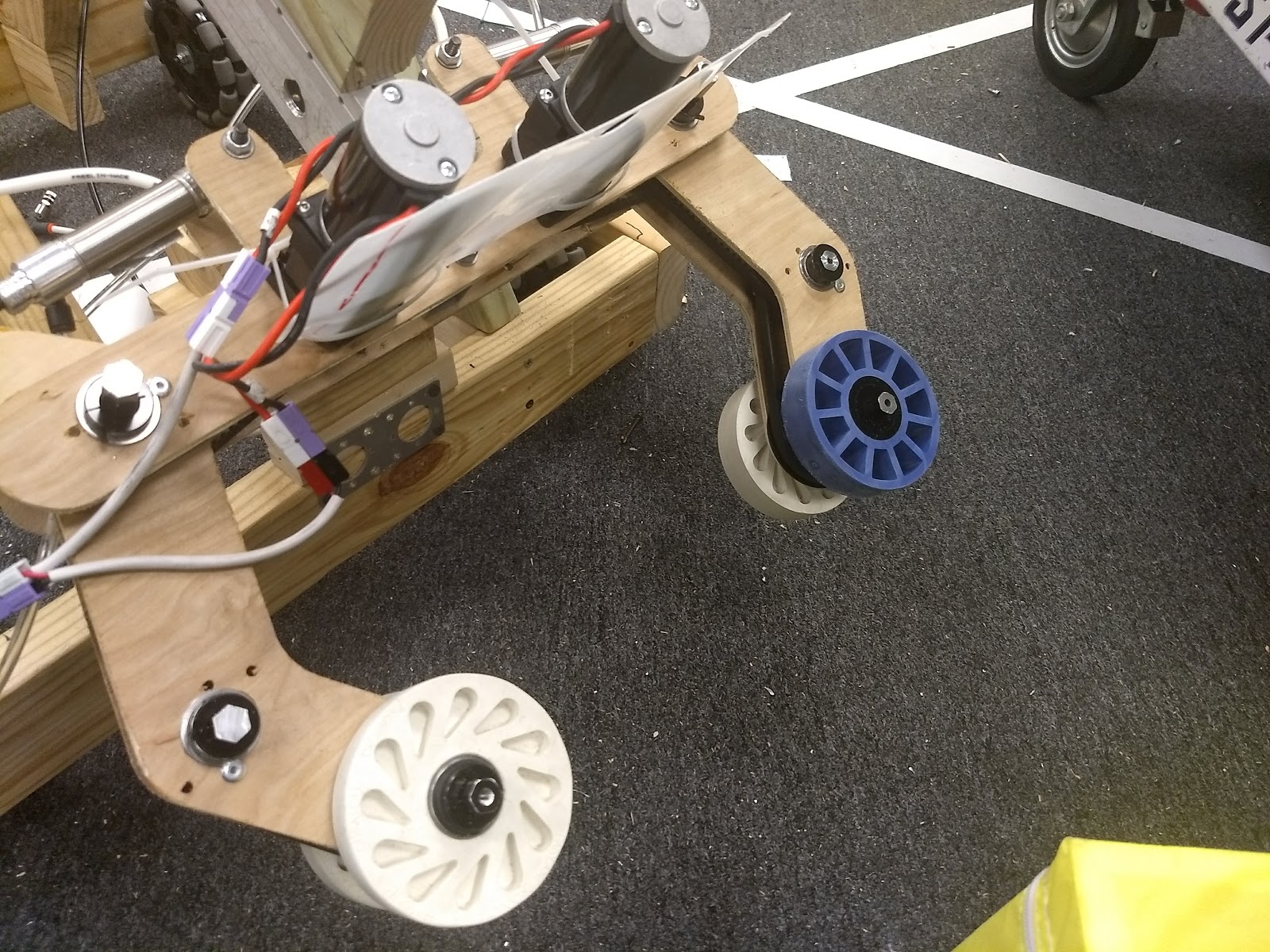 This weekend we removed the bumper which will force us to have a bumper gap in the front and back of our robot that we don’t really want to do but it will let us intake far better. We also swapped one of the fairlane wheels that was intaking for different wheels and that stopped our center jam problem since now the other wheel can slip and the fairlane wheel can go over the corner of the cube and intake it happily.