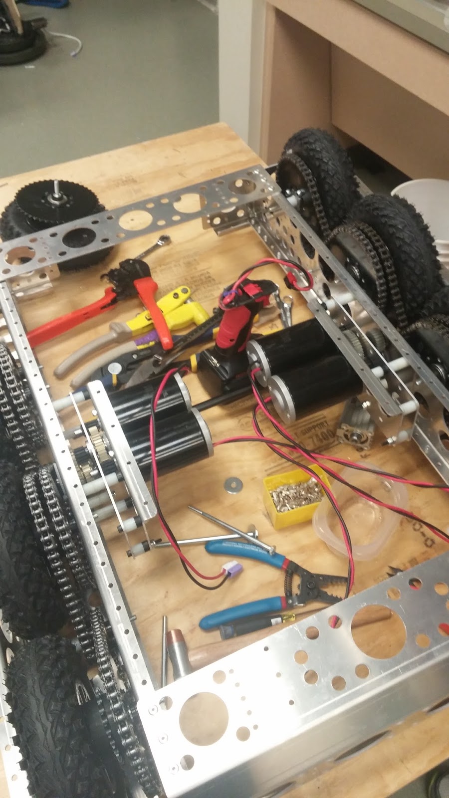 We just got all the parts back this morning. We were able to get the practice robot up and driving and should have the real chassis ready for powder coat on Monday morning. Tomorrow we will mount the intake on the robot and should be able to test the most important two functions of the robot Drive Train and Intake. We still have a few more things we are missing and will get made once our sponsor has their machine running again.