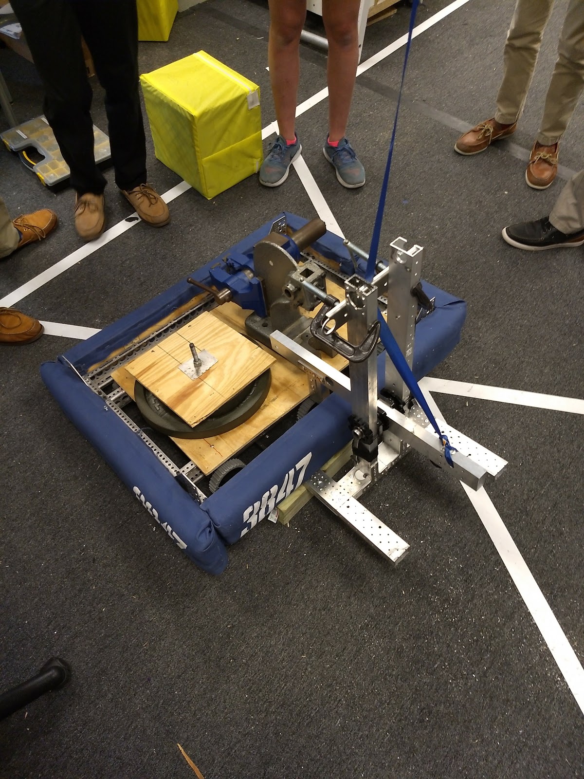 We are converting our 2014 practice chassis into a prototype for this robot. Mainly because it’s 28″ long just like our current planned robot. We added a quick 2×4 A frame and Arm mock up to lets us see the geometry that we are working with. The shoulder joint is off axis with the arm to allow the extension to go through the joint without having to two separate pivot arms clamped around the extension tube like 233 and 2168 example arms. This will present slightly different heights to each side of the arm’s motion but with much of this game relying on imprecise movement (place a box in a 3′ by 4′ plate) it shouldn’t effect us too much.