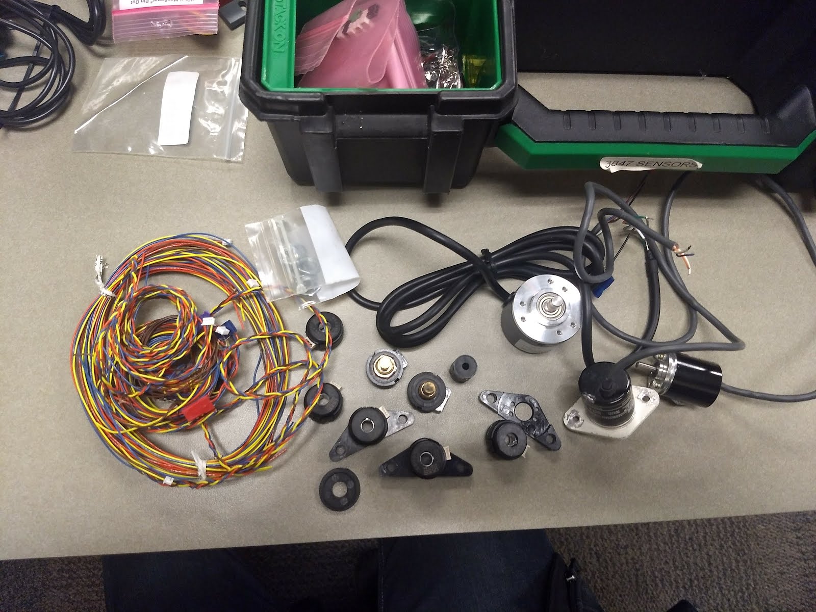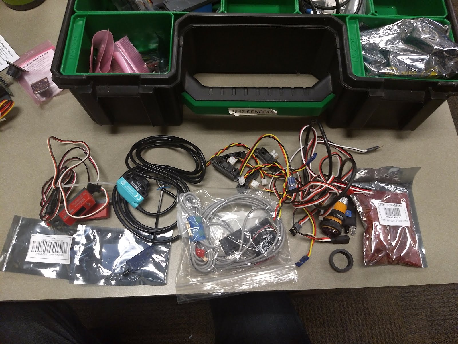 We are looking at our sensors case today. It’s also a bit disorganized. This is a collection of sensors taken from old robots, KOPs, and things we purchased as well. Some it is just used for testing or to lend out at events in case another team needs something.